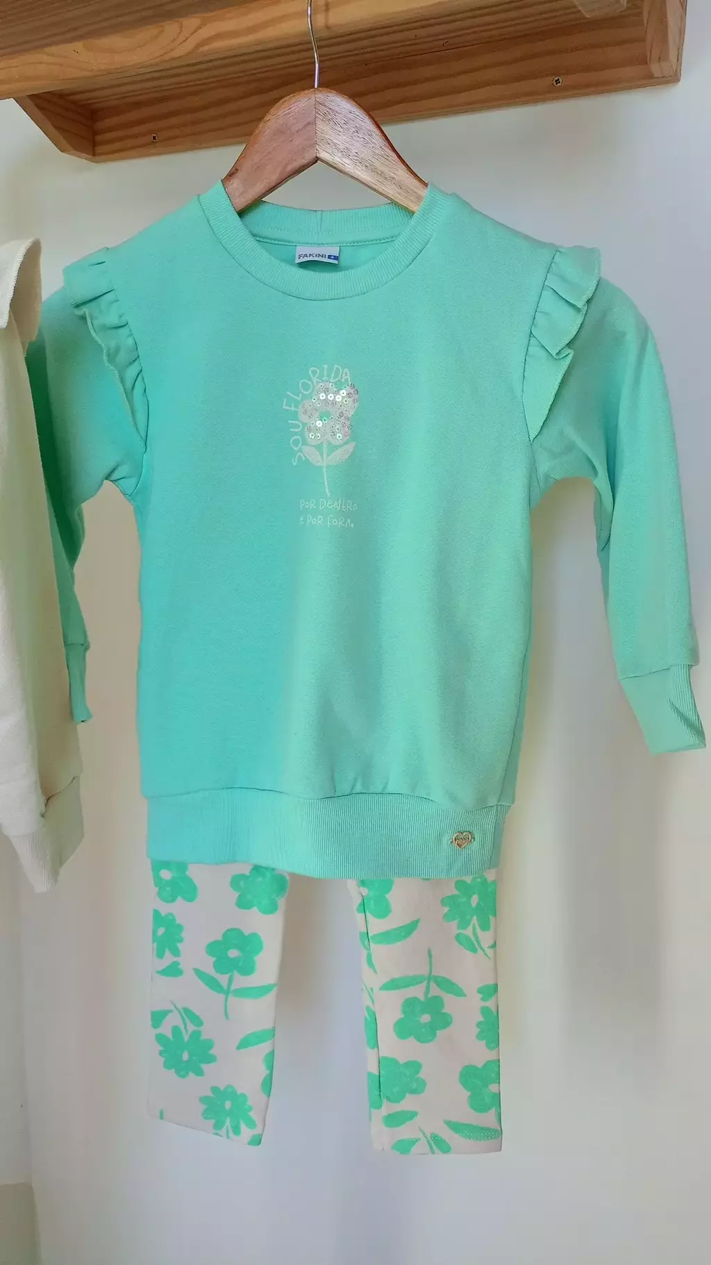 Deixe os dias mais confortáveis e estilosos com este lindo conjunto infantil! Composto por um blusão em moletom macio e aconchegante, ideal para os dias mais fresquinhos, e uma calça legging estampada super charmosa, que garante liberdade de movimento e um toque de diversão ao look.